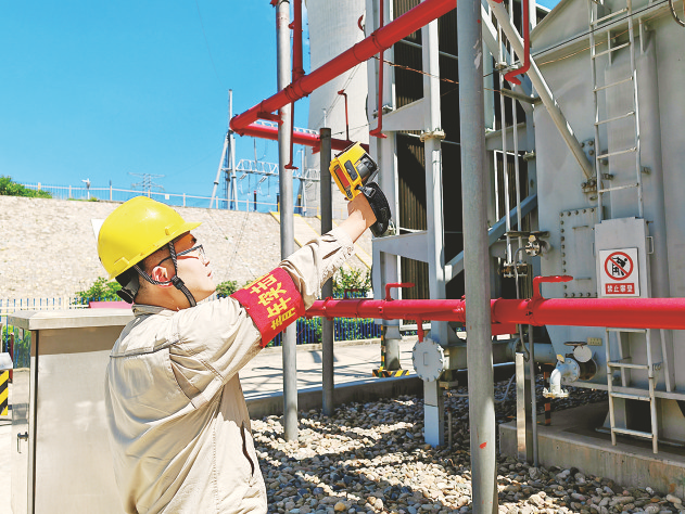 7月10日,安徽蚌埠公司职工检测主变温度。连日来,皖北地区温度持续升高,该公司加强发电设备巡检工作,确保防高温措施落实到位,保证机组安稳度夏。本报通讯员