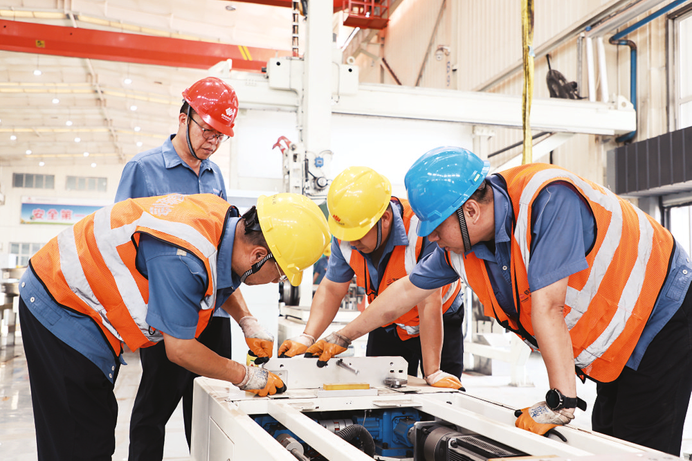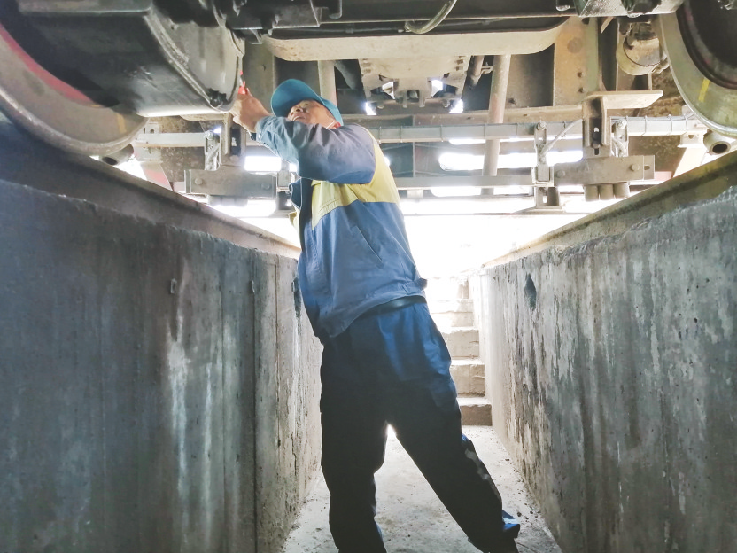 为消除高温天气对铁路运输安全生产带来的不利影响,平庄煤业运输公司全面排查内燃机车走行系统、油水系统等薄弱环节,消除机车质量隐患。图为7月31日,检修人员检查机车走行部位。本报特约记者 乔立宇 摄