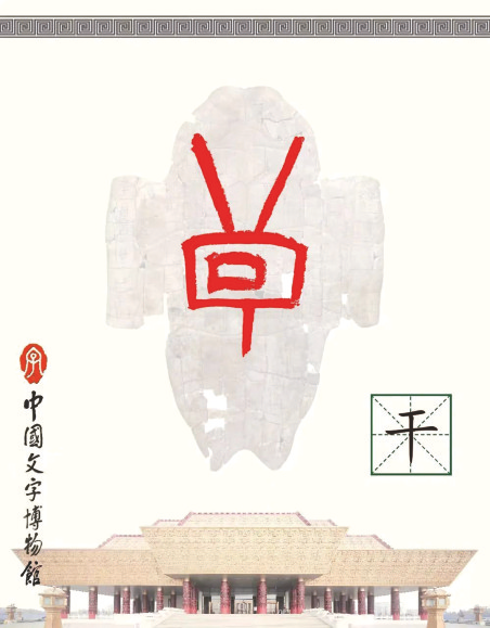 甲骨文“干”字描绘了一面上部有羽饰的盾牌。盾是防卫武器,所以“干”能引申为“捍卫”,是“捍”的初文。“干戈”一词中的“干”即指盾牌,用本义。卜辞中表示捍卫、防御。在六书中属于象形。