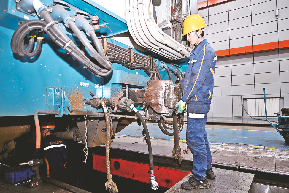 针对近期早晚温差大影响机车质量不利因素,包神铁路机务分公司加大力度进行隐患整修工作,紧盯机车重点部件,对排查出的问题明确时间节点整改,全方位提升机车“御寒”能力。图为10月18日,员工拆卸车钩。本报记者 高 珊 摄