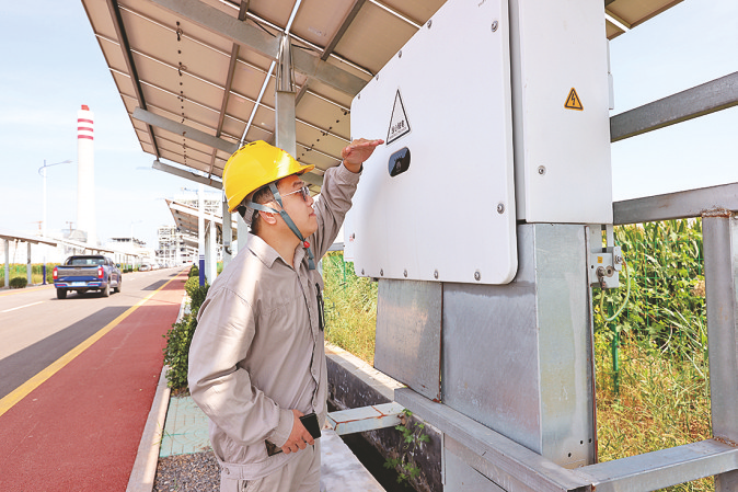 山东博兴公司在基建期利用进厂道路两侧、厂区围墙等区域同步建设了厂区一期光伏项目,总装机容量为2.09兆瓦,平均年发电量为265.64万千瓦时,年节约标煤量800.9吨,运行一年多来,具有良好的环境效益、经济效益以及社会效益。大图为进厂道路两旁的光伏板(摄于10月14日)。小图为运行人员巡检光伏设备运行情况。本报记者
