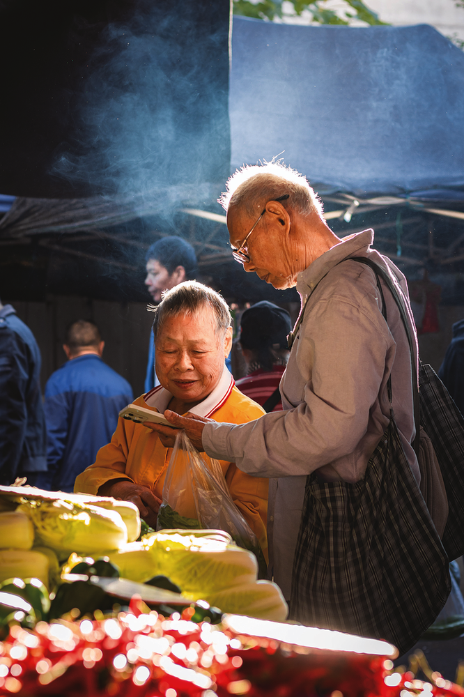 在菜市场熙熙攘攘的一隅,晨曦洒在摊位前,老爷爷正耐心地教老奶奶使用手机支付,他戴着老花镜,那满是皱纹的手比划着,眼神中满是专注。老奶奶面露微笑,认真地听着。阳光勾勒出他们的身影,每一丝银发都在光中闪耀,那是平凡岁月里最温情的画面。