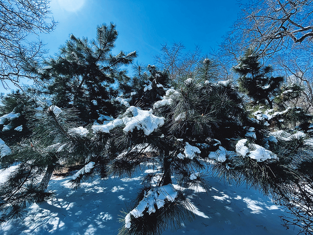 寒冬,公园树木枝丫纵横交错。树上落雪,厚处如毛毯裹枝御冬,薄处像白霜镶枝耀阳。风拂枝动,雪落如琼花纷扬,为静园添一抹灵动。