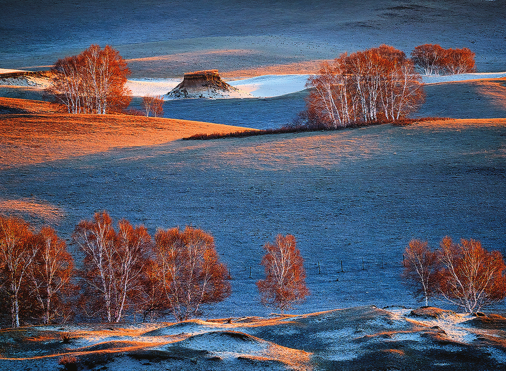 初冬的足音,悄然落在草原的肩头,如披上一袭素裳,雪景如画,惹人沉醉。余晖脉脉,为白雪披上了一层金纱,使其更显雍容华贵。此时,心已沉醉,愿在这草原的怀抱里,听雪落,待花开。