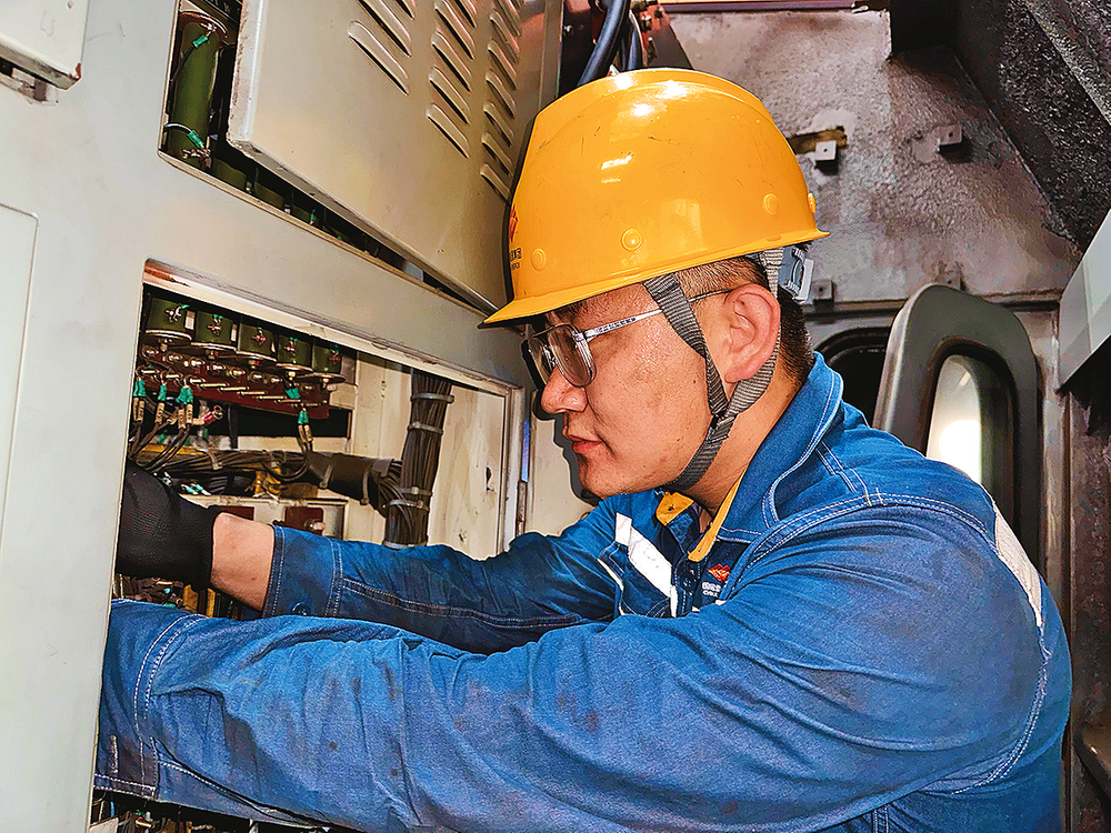 6月3日,包神铁路机务分公司对检修库内电气设备“把脉问诊”,确保电气设备正常运转。图为作业人员检查机车设备线路状态。