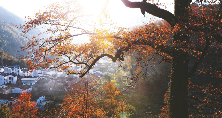 夕阳西斜时,红枫林和古村庄都披上了金色的霞光,枫红似火,默默地守望着千年古村的人间烟火和静谧安详。