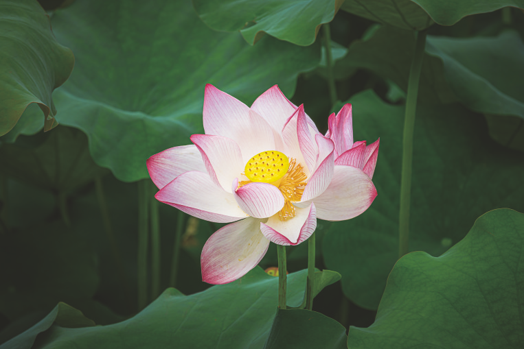 粉白花瓣晕染柔美,金黄花蕊藏着夏日絮语,在墨绿荷叶簇拥下,这朵莲静静诉说:“污泥难染我清欢”。