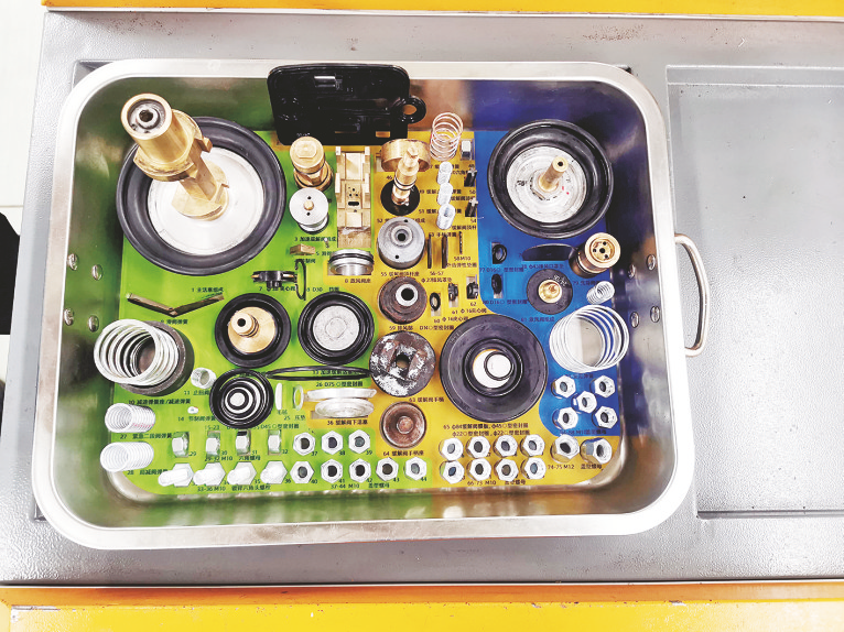 铁路装备沧州分公司对控制阀内部配件按区域以颜色进行划分,共分为绿色主阀、黄色半自动缓解阀、蓝色紧急阀三个配件区域,使现场职工在组装过程中能够直观地看到每个配件的名称、规格、型号、使用部位等信息。同时,通过托盘内对应各个配件的标识定位槽,实现区位隔离的“一阀一盘”精准配送,扎实保障了所有辆份配件的完好性与可靠性,改变了传统的同材质配件分别进行配送的简单模式。