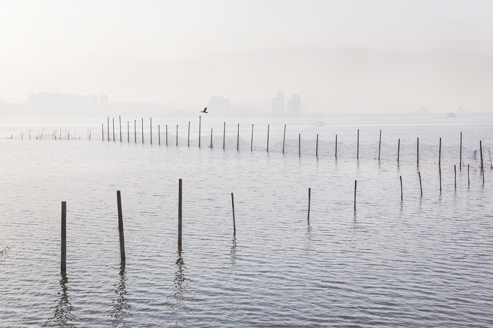 连绵起伏的山峰,被淡淡的晨雾笼罩,若隐若现。浩瀚的湖面上,鸟儿在渔网桩上或栖息或嬉戏。清澈辽阔的湖泊,水产丰美,滋养了无数生命。
