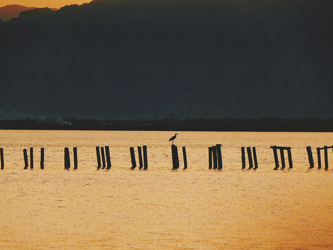 暮色降临,木桩静立水中,孤鹭停驻其上,粼粼金波轻晃,将天边最后一抹霞光揉碎在涟漪里,鸟与山的静谧,恰好沉淀了这黄昏时分的安然。