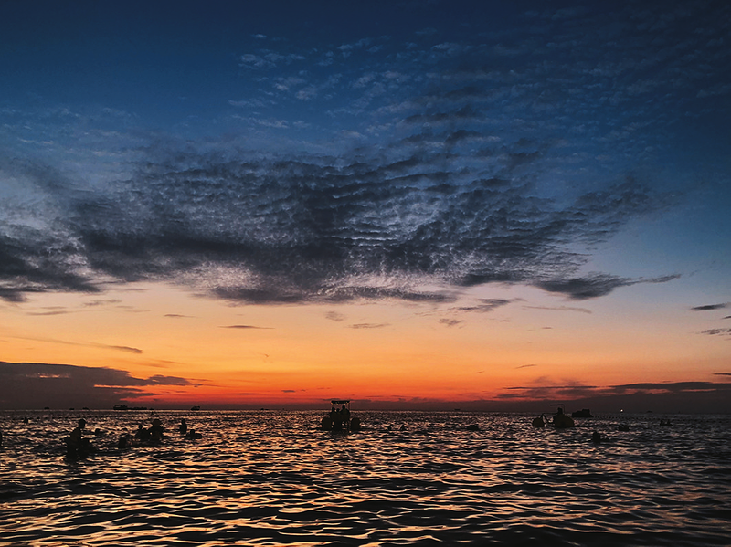 黄昏时分,落日余晖把海面染成暖金色,天空中,蓝色与金色渐变交融。人们或戏水,或乘舟在这海边的暮色里,尽享惬意时光。