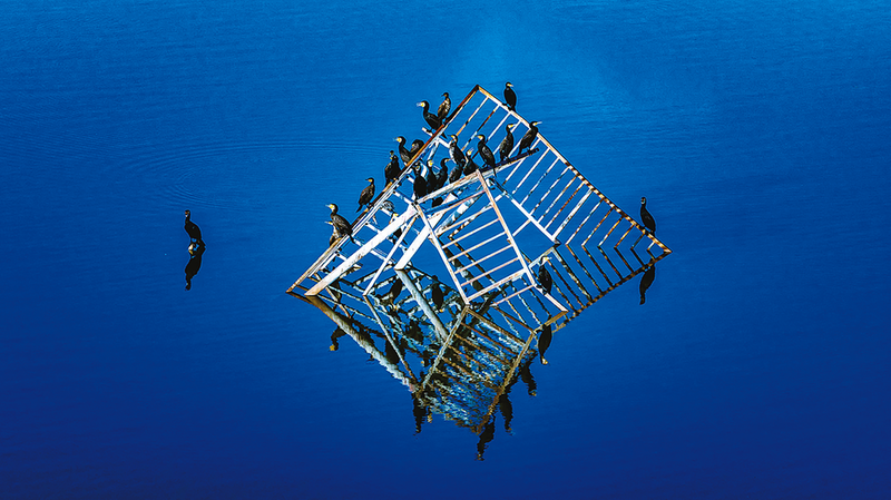 无人机掠过水库的刹那,水中一幅独特图景被瞬间定格。高空视角下,寻常栏杆与鹈鹕的倒影浑然一体,化作富有韵律的几何之美。