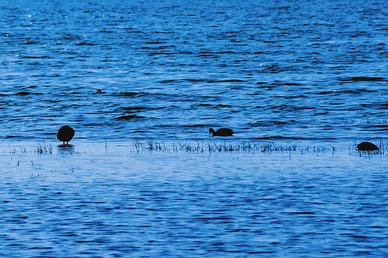 澄澈的水面泛着粼粼波光,几只水鸟或静立浅滩,或低头觅食,悠然自在。水中的细草随波轻轻晃动,尽显自然间的恬淡与闲适。