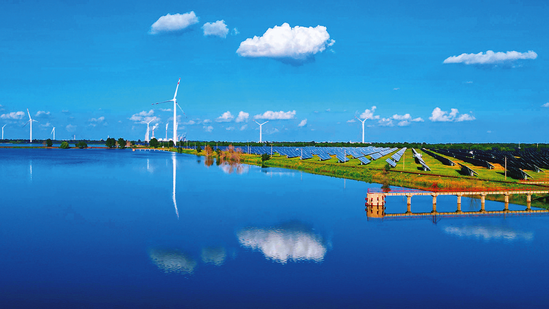 蓝天白云碧水如镜,风机错落、光伏成阵。池水的静谧与风机旋转的动感、光伏阵列的秩序,形成强烈对比,既流露生态和谐的诗意,又彰显产业转型的蓬勃力量。