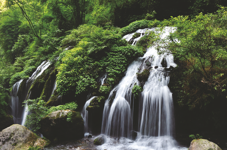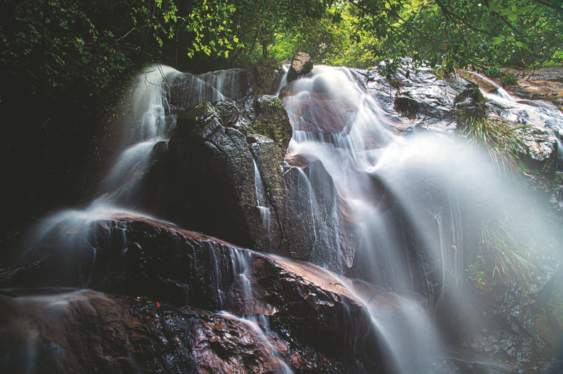 层叠的瀑布从葱郁山林间倾泻而下,水流如银练般灵动飞溅,利用慢门,使水流如丝般柔顺,如云雾般缥缈,与四周繁茂的绿植、苍劲的岩石相映成趣。