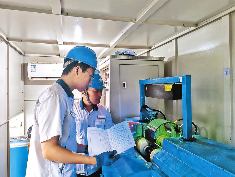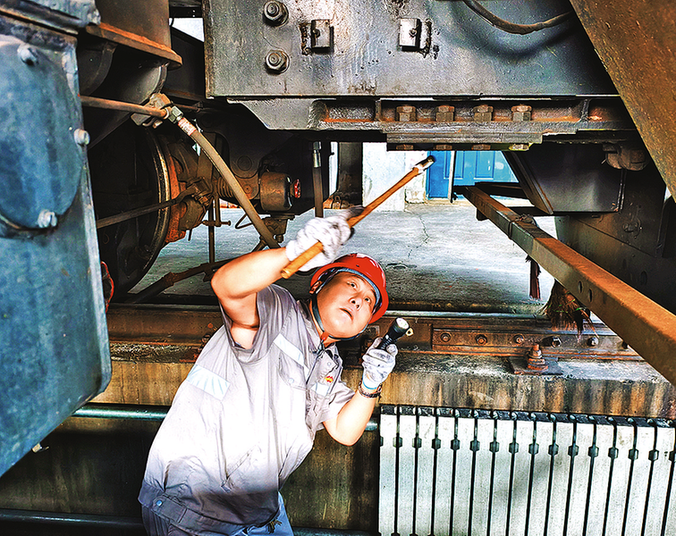 雁宝能源运销公司强化机车隐患排查,组织技术骨干对机车走行部、制动系统等关键部位开展精细检查,利用专业工具排查潜在故障,严格落实标准化作业,及时消除安全隐患,保障运输高效、安全。图为9月10日,内燃机车司机检查机车走行部螺栓状态。本报通讯员 李 飞 摄