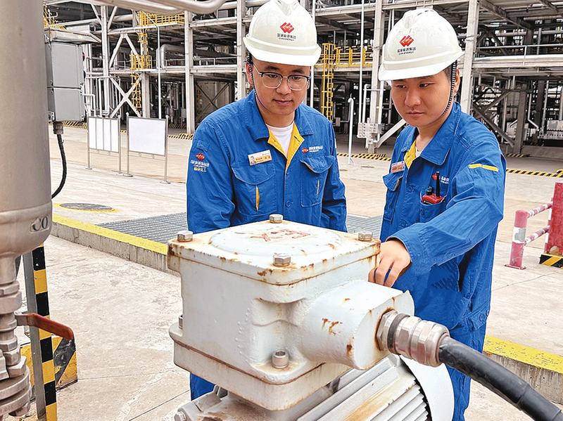 榆林化工将“师带徒”课堂搬到检修现场,安排技术人员结合乙二醇装置检修情况,指导青工学习精制单元停进料、切蒸汽等重点操作,详细讲解受限空间、动火等特殊作业的票据办理、风险辨识及管控措施,确保青工学懂弄通、学以致用。图为9月21日,技术人员(右)为青工讲解离心泵停泵步骤。本报通讯员 张 瑜 摄