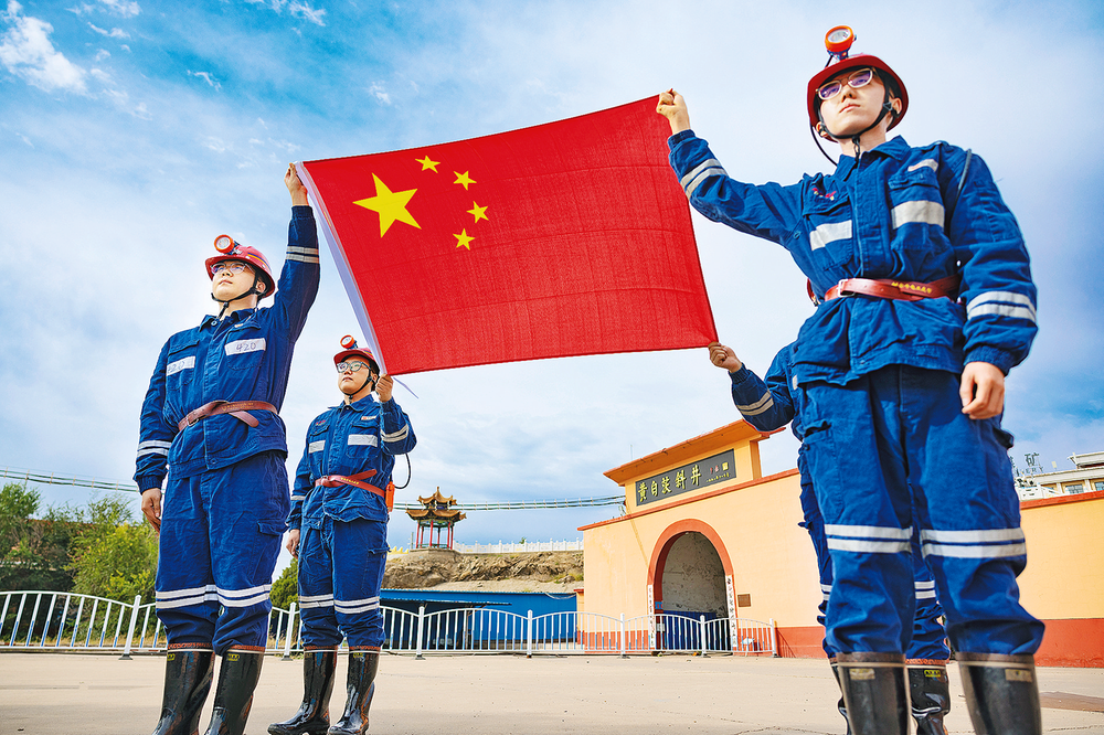 乌海能源黄白茨矿业公司青年职工在煤矿生产一线挥洒青春,用奋斗与担当,为新中国华诞献上真挚的贺礼。图为9月25日,青年职工在井口与国旗合影。本报通讯员 薛 茜 摄