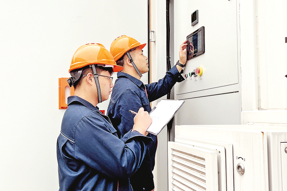 每天班组都要完成例行巡检,他们穿着反光背心,逐个检查电池仓的温度、湿度,盯着电池电量SOC值、液冷系统的细微变化,甚至要凑近听火灾报警器的声响,严防过温或电池簇过充过放,生怕一丝疏忽影响国庆期间绿电供应。
