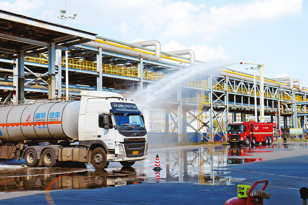 日前,包头化工联合包头市生态环境局开展甲醇介质泄漏应急救援演练。演练中,各应急小组响应迅速、协同有序,严格遵循应急预案展开操作。通过演练,全面检验了该公司应急预案的实用性,进一步夯实与市生态环境局在事故处置中的联动协作机制。图为应急演练现场(摄于9月29日)。本报特约记者 张晓刚 摄