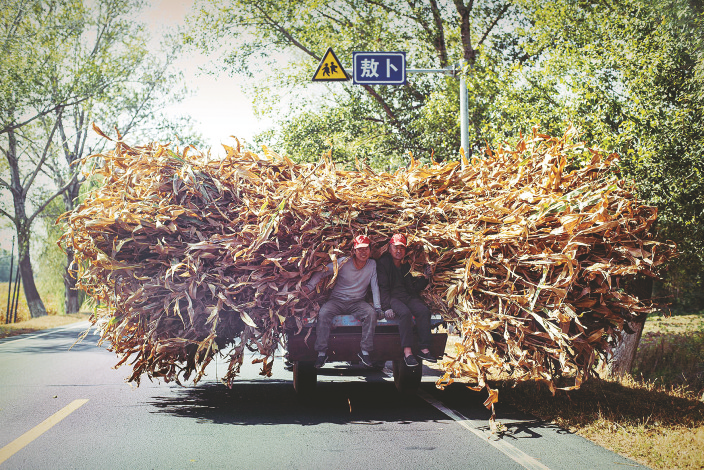 秋日的风掠过林间,路牌静静立在道旁,细听着丰收的故事。两位农人坐在满载玉米秸秆的金色“浪涛”里,笑意漫在眼角,仿佛这一车,载着整个季节的饱满丰盈。