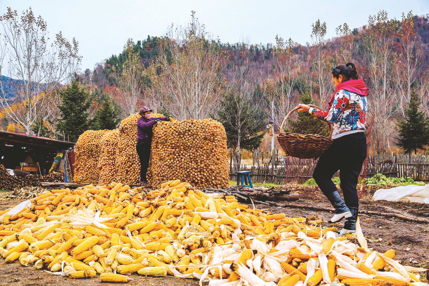 秋日的小兴安岭,层林尽染色彩斑斓,林场中堆积如山的金黄玉米,像洒在大地的阳光,与山林相映,把秋日的饱满与热烈都装了进去。