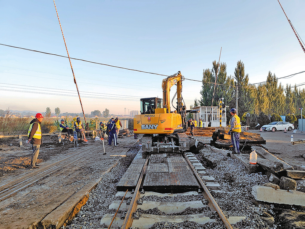 9月21日,经过紧张施工,平庄煤业运输公司平庄段总机厂有人看守道口顺利完成施工恢复通车。此次道口升级改造施工将道口轨枕、钢轨、铺面全部更换,并将木枕更换为水泥枕、道口轨排铺面升级为橡胶铺面,有效提升机动车辆通过道口能力,减少工务维修道口作业量,切实保障道口行车安全。图为多功能机进行铺设道口铺面作业。本报特约记者 乔立宇 摄