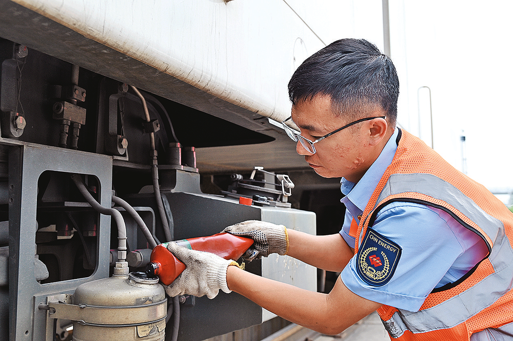 10月以来,包神铁路机务分公司聚焦机车关键部件的维护保养,重点加强机车走行部的车钩、车钩吊杆等易磨损部件的给油处理,确保连接机构灵活可靠。图为10月9日,乘务员进行给油作业。本报通讯员