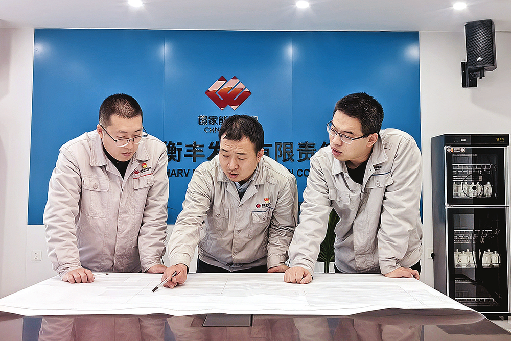 该项目位于河北省衡水市武邑县龙店镇和圈头乡,规划装机容量19万千瓦,新建一座220千伏升压站及运行管理中心,同步配套建设储能设施。建成后,每年可输送清洁电力4.71亿千瓦时,与相同发电量的火电厂相比,每年可节约标准煤约14.17万吨,减排二氧化碳约38.82万吨、二氧化硫约39.10吨、氮氧化物约62.66吨,具有良好的经济效益、环境效益和社会效益,对促进当地经济发展、实现绿色低碳目标起到积极推动作用。图为10月15日,项目工作人员研究讨论设计图纸。本报通讯员 杨志刚 摄