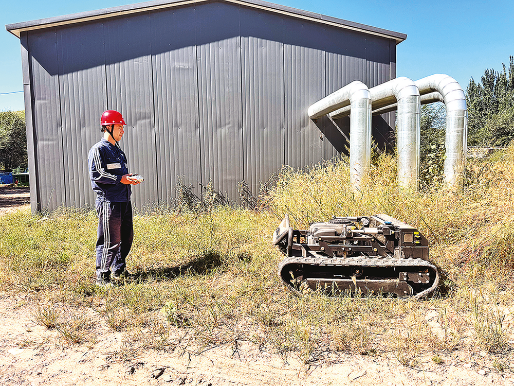 近日,平庄煤业矿建公司新引进的MDE越野坦克608—90A遥控打草机正式投用。该设备越野性能卓越,能轻松应对矿区复杂地形,有效解决了传统打草方式劳动强度大、作业效率低、耗时久的痛点,显著提升了矿区生态治理的进度与效率。图为10月15日,职工操作遥控打草机清理杂草。本报通讯员 毕志鹏 摄