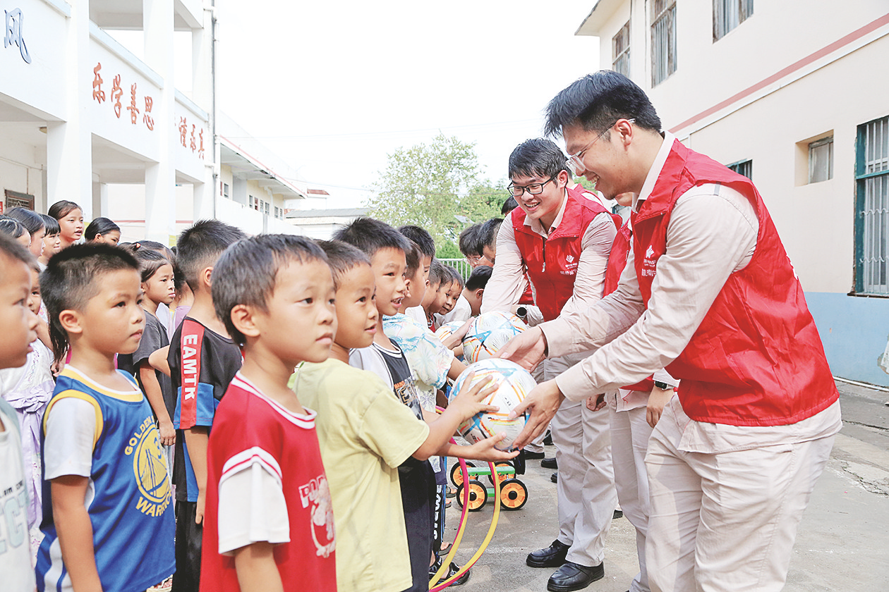10月17日,广西南宁公司团委组织青年志愿者赴南宁横州市六景镇利垌村委小学开展“金秋助学筑梦前行”主题活动,为师生送去篮球、足球等体育运动器材,以实际行动助力乡村学子成长。图为青年志愿者向孩子们赠送体育运动器材。 本报通讯员