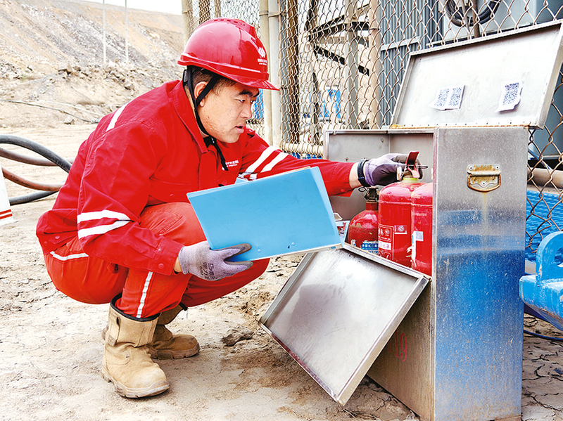 近期,准能黑岱沟露天矿聚焦秋季火灾防控重点,组织青年职工对移动变电站、高压开关柜、箱变等关键区域实施“拉网式”排查,精准消除火灾风险点,筑牢安全生产防火墙。截至目前,排查发现的5项隐患问题已全部按“五定”原则整改完毕,闭环管理率达100%。图为10月29日,维修电工检查灭火器压力值。本报特约记者