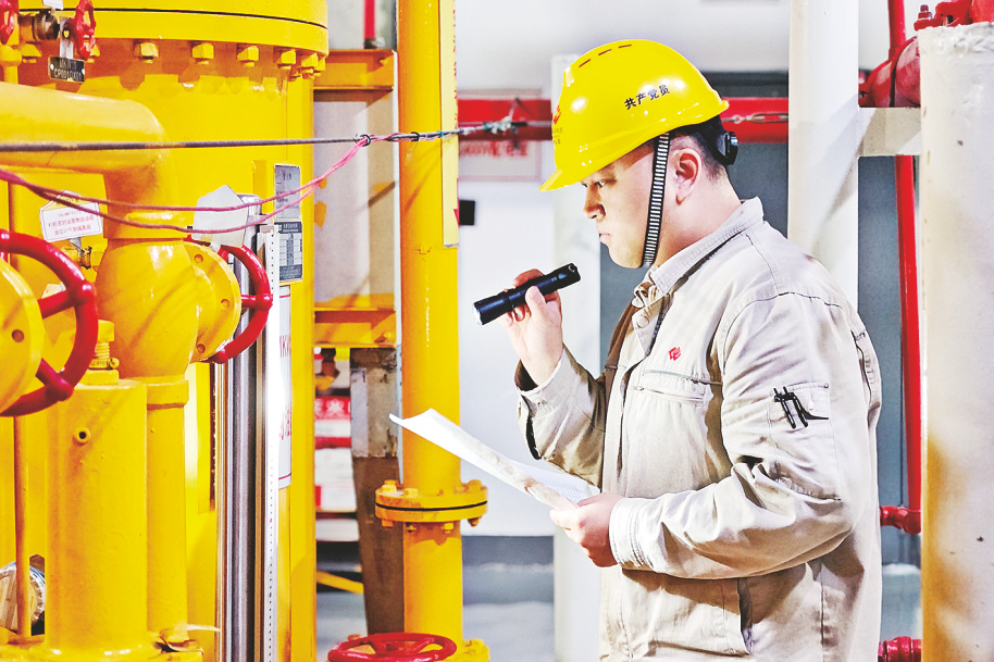 11月14日,安徽蚌埠电厂结合迎峰度冬能源保供工作重点,开展防寒防冻隐患排查大整治,全力做好安全生产保障工作。图为运行人员核对密封油箱油位。