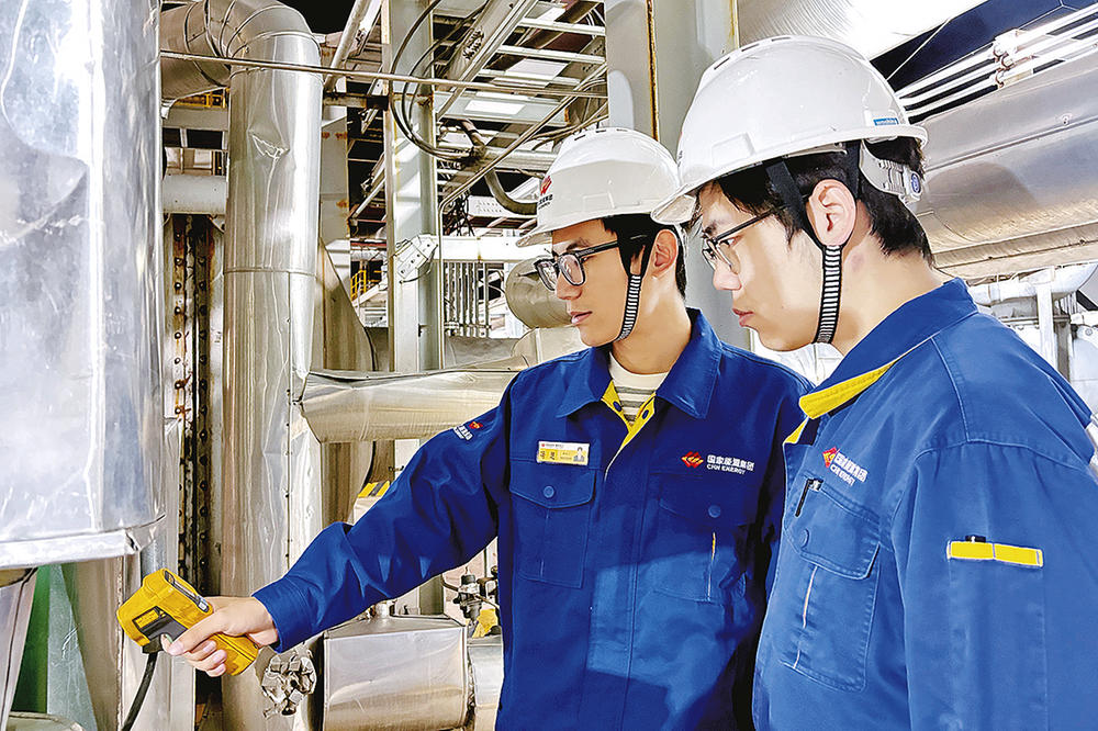 入冬以来,榆林化工围绕冬季安全生产特点开展专项实战培训,采用“实战化”与“情景化”教学,提升青年职工实操能力,为装置平稳运行提供技能保障。图为11月14日,师傅(左)带领青年职工检查风机换热器冷却水温度。