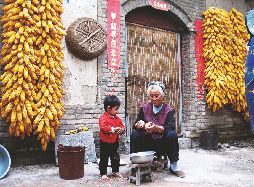 老屋门前,老人坐在板凳上低头削梨,果皮打着旋儿落下。旁边的小孩光着脚丫耐心等候,阳光裹着清甜的梨香,把乡村生活的温柔全揉进了这幅画里。