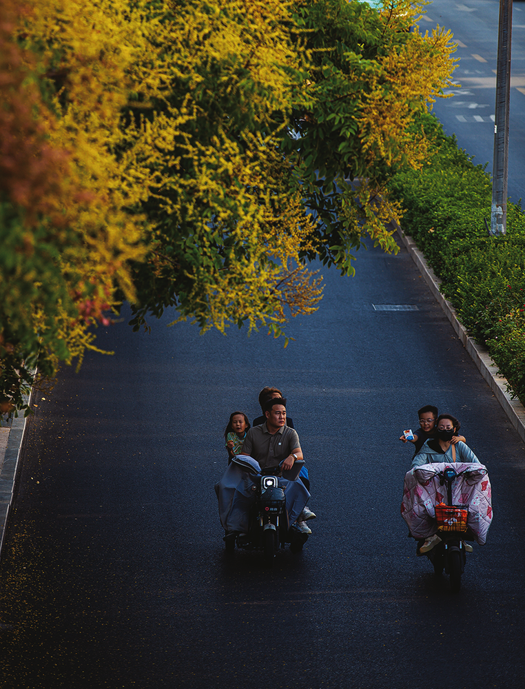 栾树正以最绚烂的姿态迎接深秋,金黄色的细碎花簇像被阳光打碎的琉璃,密密匝匝缀满枝头,风过时簌簌飘落。傍晚时分,妈妈带着刚放学的孩子回家,后座的小朋友看到飘落的花瓣兴奋地喊道:“下黄金雨了!”
