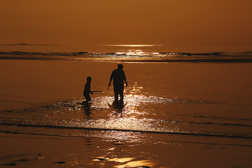 黄昏将海与天晕染成暖金色,海浪轻吻沙滩。一对身影在浅滩间嬉戏,在落日余晖里凝成剪影。波光如碎金跳跃,时光在此刻慢淌,亲子的温情与海滨的静谧,都被定格在这帧温柔的景象中。
