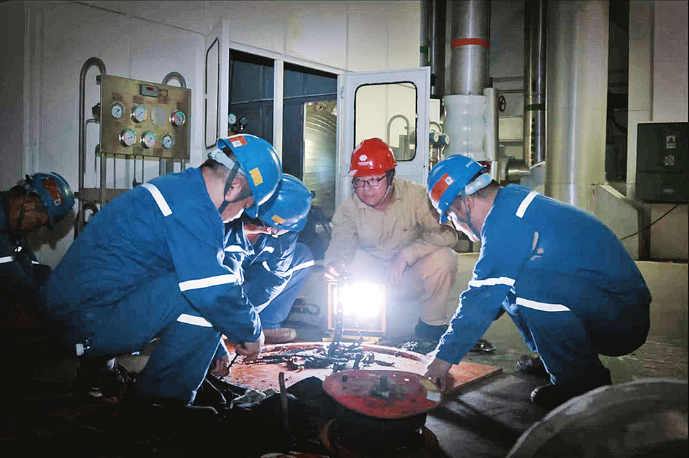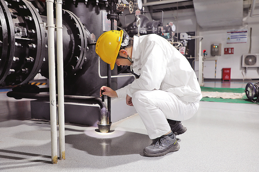 石角热电运行人员查看闭式冷却水泵放水状态。