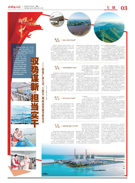 作为区域能源供应的重要支柱,广西公司在“十四五”期间,牢牢把握新时代发展的脉搏,走出了一条以能源安全为基、以绿色转型为翼、以党建引领为魂的高质量发展之路,为八桂大地的经济社会发展注入了强劲的“动力源”,也为祖国南疆天穹描绘了更加亮丽的生态底色。 (内容详见第三版)