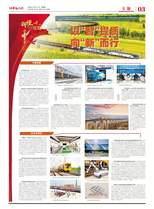 “十四五”期间,铁路装备开启“强而优”转型之路,全力提升一体化装备保障能力,依托“1+5”智慧调度生产运营管理平台,为集团公司增量上产、高效调运提供优质运力保障。发挥“定检+状态修+通过修”综合修程修制独有优势,推动机车车辆检修模式和布局持续优化,研发国内铁路货车首套智能巡检机器人投用,部署智能TFDS动态检车作业系统,研发自供电北斗定位装置装车超万套,带动传统人工检修向一体化智能化运维转型。全面推进安全生产管理体系建设,创建“1435”安全文化,建成集团公司运输板块首个智慧安全警示教育基地,不断刷新安全生产长周期纪录。同时,深入实施“智改数转”三年行动,加快产业焕新升级,全球首批碳纤维复合材料轻量化重载铁路货车投入运营、重载铁路废弃清筛砟土资源化产品试制成功,以科技创新赋能重载铁路装备绿色低碳、智能安全发展;高标准建设智慧工厂,全国铁路制造企业首个闸瓦制造自动产线建设示范项目通过验收,实现闸瓦全流程智能化、无人化生产;高质量开发数据资产,产业数据价值挖掘在集团公司内部率先实现数据要素经济效益转化,数据管理能力成熟度量化管理通过4级认证,成为国内铁路货运领域首家获得该级别认证的企业;高水平制定行业标准,编制《重载铁路配属货车状态修基本要求》团体技术标准正式发布,填补了我国重载铁路货车状态修技术标准领域空白。