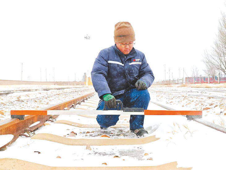 12月12日,焦化铁路公司“闻雪而动”,对设备进行拉网式巡检,不间断上线扫雪、融雪,确保管内正常运输秩序。图为线路作业人员检查线路几何尺寸。本报通讯员