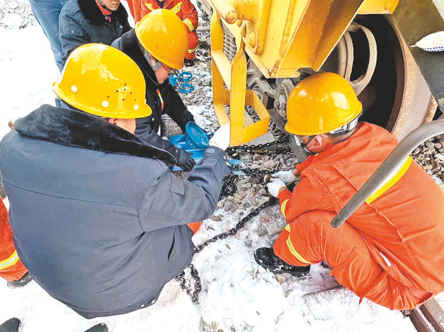 12月15日,包神铁路机务分公司开展雨雪天气应急救援演练,各部门围绕人员组织、设备调运等方面密切配合,圆满完成液压起复设备的安全操作等演练内容,进一步提升了应急救援作战能力。图为演练实操现场。