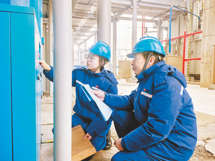 元旦假期期间,山东聊城公司部分干部职工坚守一线岗位,对全厂设备系统进行全面排查,确保设备系统“零缺陷”运行。图为1月3日,检修人员排查母线绝缘防潮装置隐患。