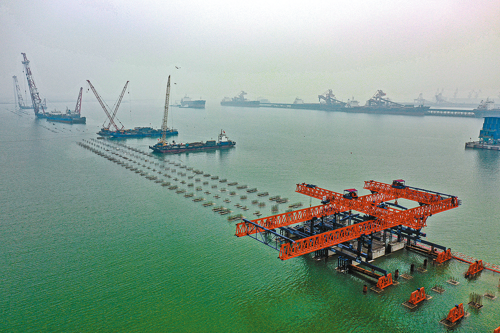 1月5日,黄骅港务五期工程施工现场一派繁忙。筑港机将轨道梁及管沟梁精准安装至指定位置,远处的打桩船则稳稳地把50米长的预应力方桩“植入”海床。