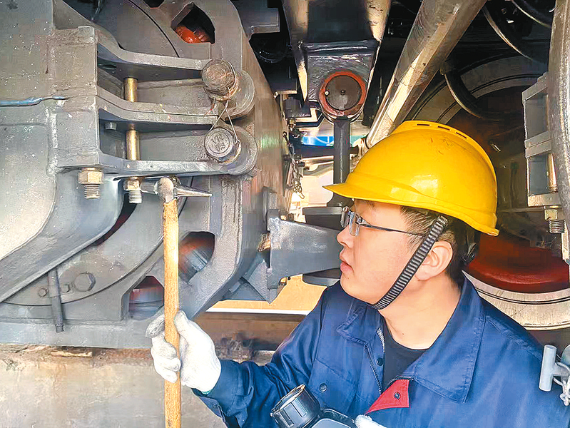 近期,西创宁东铁路公司机辆段扎实开展机车防寒过冬隐患专项检查与整治工作,实时掌握运行状态,全力保障机车在低温环境下安全稳定运行。图为2025年12月25日,检修人员检查机车走行部。本报通讯员 樊 恒 伍春霖 摄