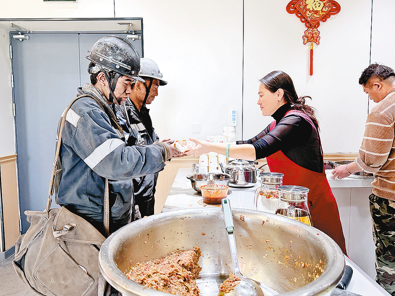 宁夏煤业任家庄矿在副立井爱心驿站配备暖心饭菜、热水、常用药品等,并结合季节特点提供姜茶、绿豆汤等特色服务,将关爱融入细节中。图为2025年12月28日,爱心驿站服务人员为升井职工送上热乎饭菜。本报记者