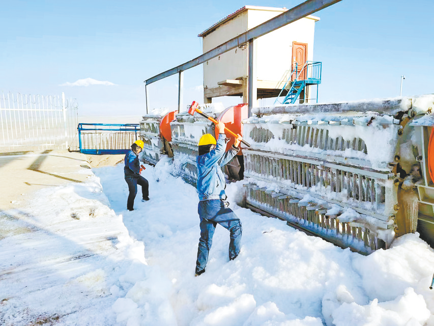 1月19日,新疆电力阿克苏公司迅速启动前池拦污栅除冰专项攻坚行动,以精准举措破解冰害难题,筑牢安全高效防线。图为水工班成员清理拦污栅积雪。本报通讯员 蒋方文 摄