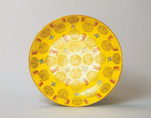 盘口微撇,弧壁,圈足。口沿涂抹金彩。外壁白釉地上均匀分布3枝粉彩折枝花纹,盘内淡黄釉地上以金彩书写29个团“寿”字,空白处点缀24个矾红彩描金蝙蝠和12个蓝料彩描金“卍”字,蝠眼以黑彩涂点。圈足内施白釉,外底白釉泛波浪纹,底中心署红彩楷体“同治年制”4字双行款。(