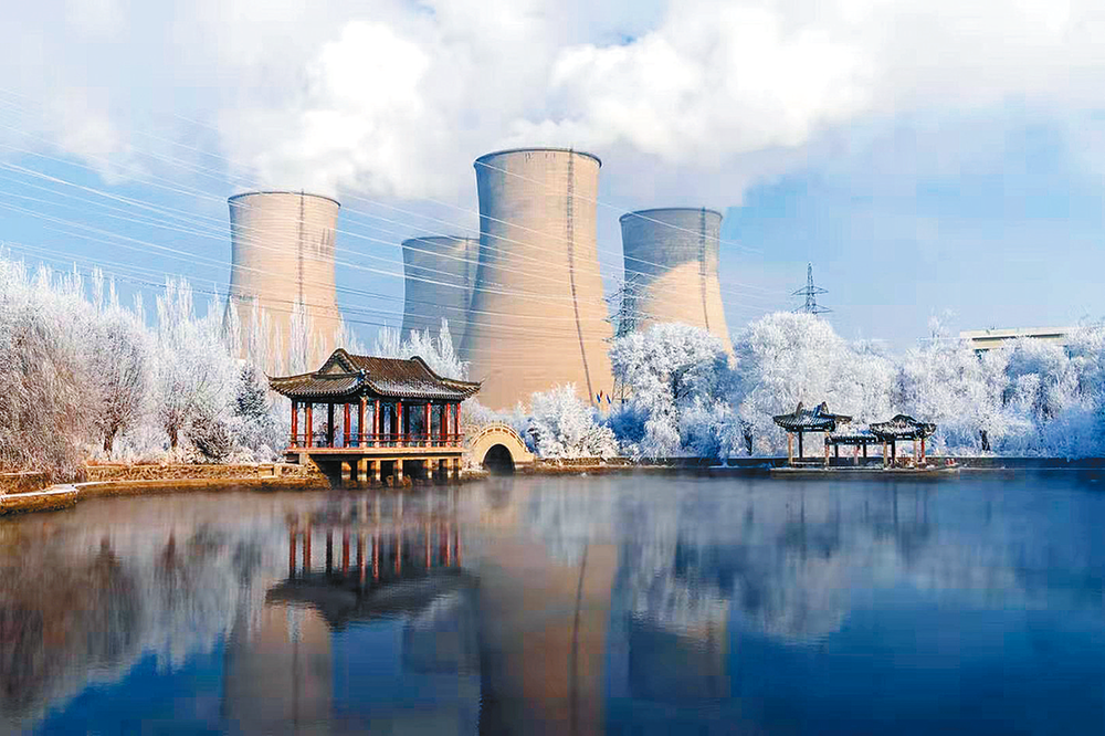 雾凇如碎玉,晕染草木素白。冷却水塔在晨雾里舒展着呼吸,暖白的云絮与琼枝共舞。亭台静立在镜湖之上,倒影与现实交织成一场晶莹的梦,每一缕轻烟,都是写给冬日的温柔密语。