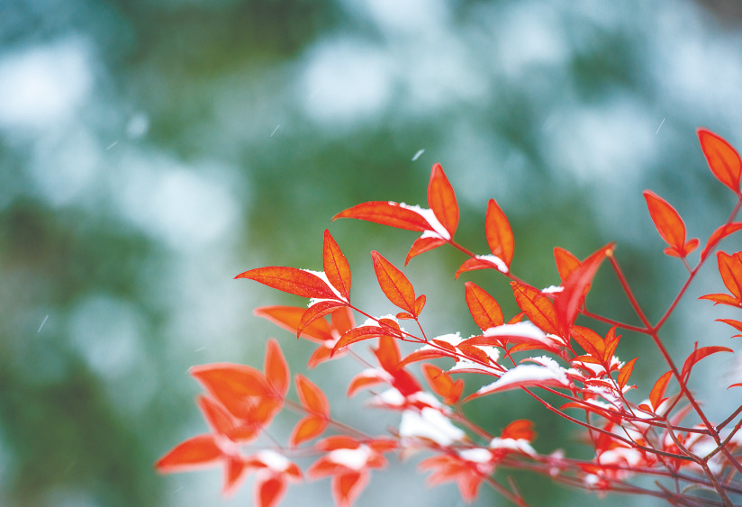 艳红叶片托着新雪,朦胧绿意衬其左右,红白相映,鲜亮夺目。风过,细雪簌簌,红叶轻颤,藏尽冬日诗意。